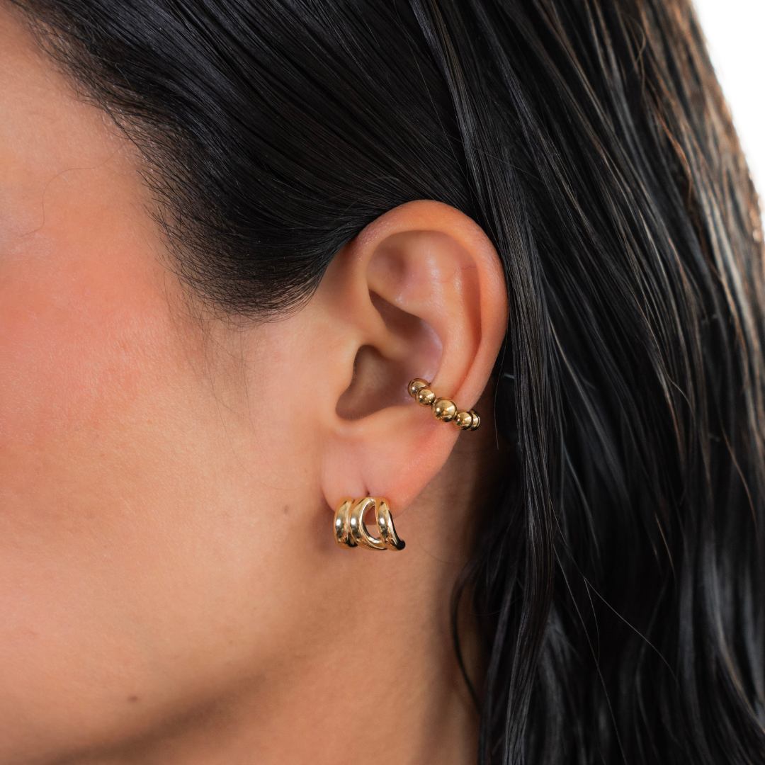 Designed to embrace the earlobe with soft curves and a sculptural silhouette, The Muse Huggies blur the line between minimal and bold. Available in both gold and silver, their fluid form catches light like a modern classic — elegant, grounded, and made to be lived in.